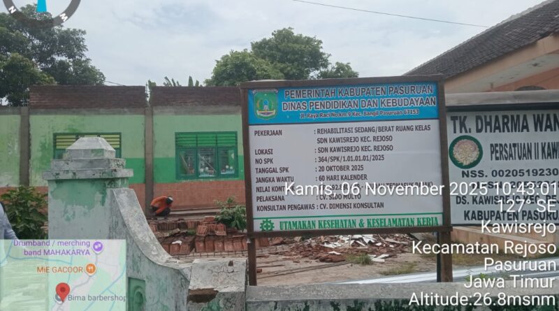 Proyek rehabilitasi ruang kelas di SDN Kawisrejo, Kabupaten Pasuruan, yang didanai oleh Dinas Pendidikan dengan anggaran Rp 192.880.428 ( seratus sembilan puluh dua juta delapan ratus delapan puluh ribu empat ratus dua puluh delapan ribu rupiah ) dari Tahun Anggaran 2025, kini menjadi sorotan tajam publik.