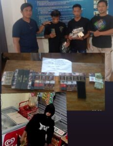 Adapun barang bukti yang diamankan beberapa slop dan bungkus rokok berbagai merek (Dji Sam Soe, Surya 16, Marlboro Black, Raptor, Gunung Mulia). Uang tunai Rp39.000. Handphone Realme warna biru. Jaket hoodie hitam bertuliskan “OFFLINE”.