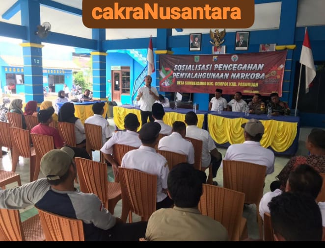 PASURUAN — Satuan Reserse Narkoba (Satresnarkoba) Polres Pasuruan menggelar kegiatan sosialisasi dan penyuluhan bertema “Bahaya Penyalahgunaan dan Peredaran Gelap Narkoba” di Balai Desa Sumbersuko, Kecamatan Gempol, Kabupaten Pasuruan, Rabu (12/11).