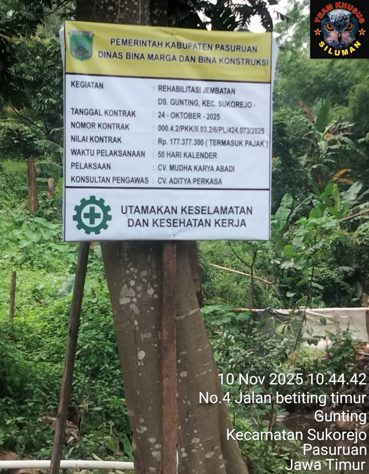 Pasuruan, Jawa Timur, Cakranusantara online, Proyek rehabilitasi jembatan desa gunting dusun betiting kec Sukorejo kab Pasuruan, dengan pelaksana proyek CV MUDHA KARYA ABADI dan konsultan pengawas CV ADITYA PERKASA, dengan nilai kontrak Rp 177,377,300,” ( seratus tujjuh puluh tujuh juta, tiga ratus tujuh puluh tujuh ribu tiga ratus rupiah ) itu sudah termasuk pajak, sumber dana tidak di sebutkan di papan proyek, dalam pelaksanaan pekerjaan sudah tidak Standart Operating Procedure ( SOP ) dan asal asalan.