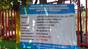 PASURUAN — 29 November 2025-Proyek rehabilitasi ruang kelas SDN Oro-Oro Ombo Wetan I, Kecamatan Rembang, Kabupaten Pasuruan, kembali mendapat sorotan tajam. Meski nilai kontrak mencapai Rp192.888.841,24, kondisi pekerjaan di lapangan justru memperlihatkan indikasi ketidaktertiban kerja akibat minimnya pengawasan, yang berpotensi menyalahi aturan teknis konstruksi yang berlaku.