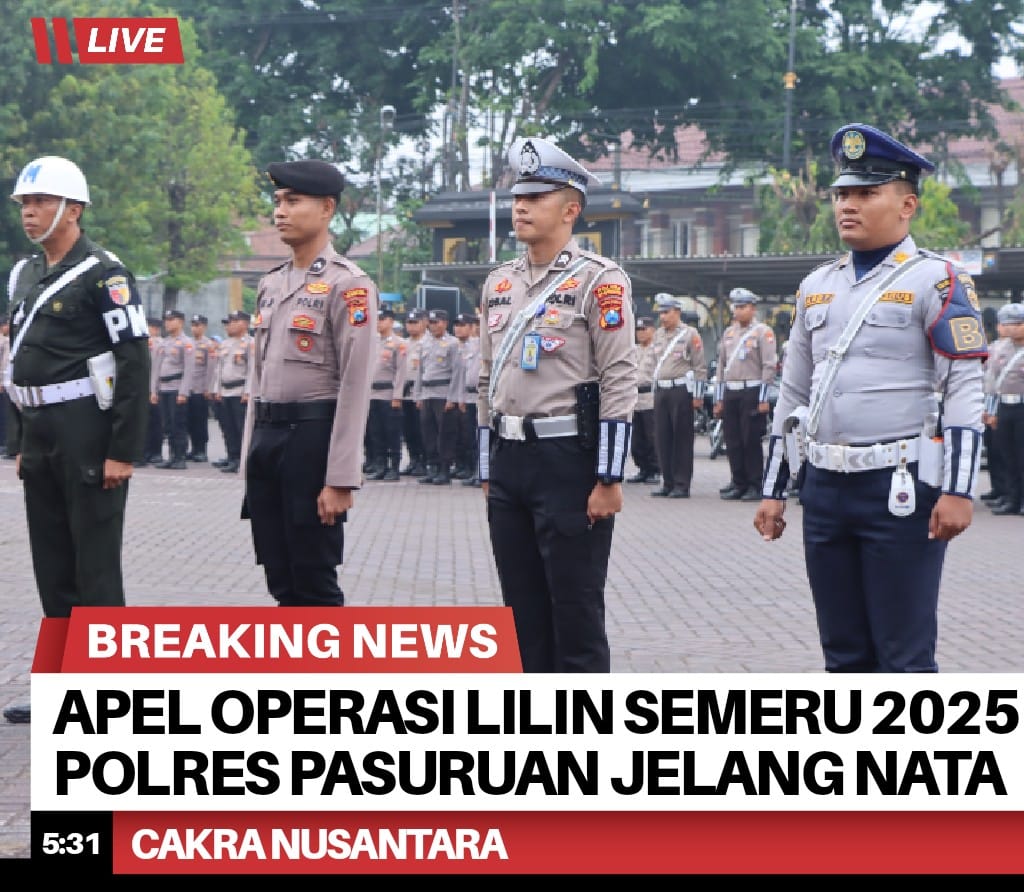 PASURUAN — Polres Pasuruan menggelar Apel Gelar Pasukan Operasi Lilin Semeru 2025 sebagai bentuk kesiapan pengamanan dan pelayanan perayaan Natal 2025 serta Tahun Baru 2026, di halaman Mapolres Pasuruan, Wicakwana Laghawa, Jumat (19/12/2025).