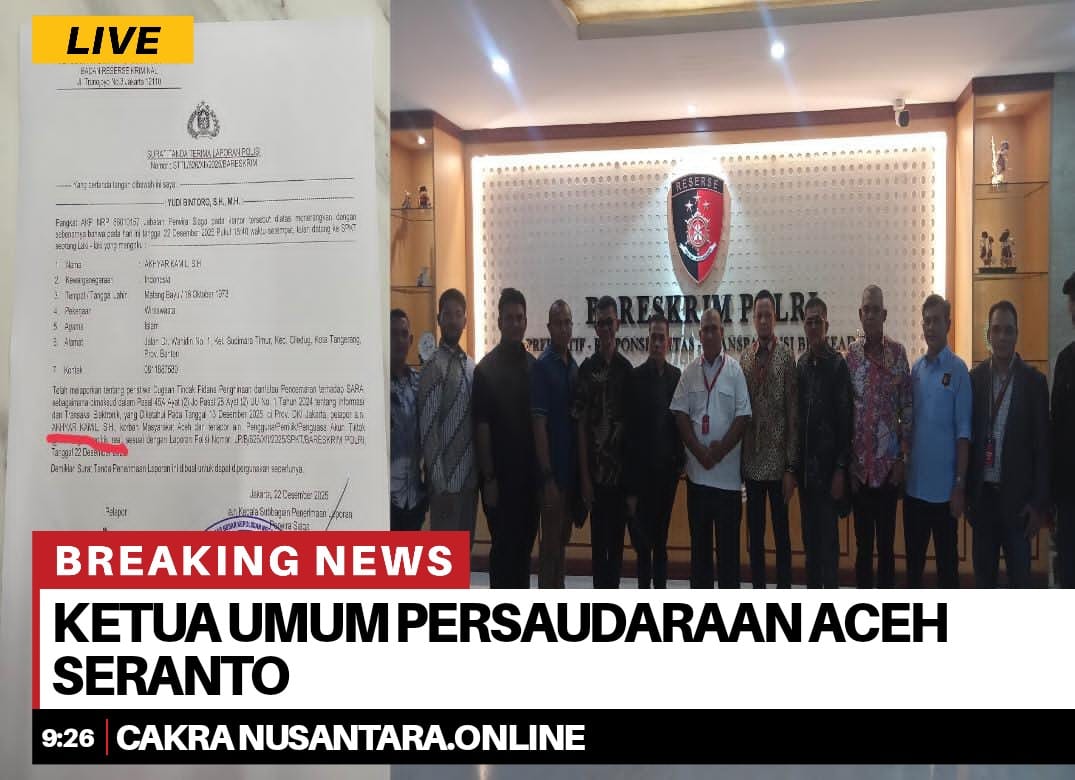 Dr. Emiral Rangga Tranggono,SH., M.H. Selaku Ketua Tim Advokasi Persaudaraan Aceh Seranto, hari ini kami membuat laporan ke Cyber Bareskrim melaporkan dugaan terhadap akun Tik tok Wdagelanpolitik, dengan laporan polisi nomer. L/B/626/XII/2025/SPKT/BARESKRIM POLRI Tanggal 22 Desember 2025.