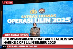 Jakarta — Kepolisian Republik Indonesia melalui Juru Bicara Operasi Lilin 2025, Kombes Pol. Umi Fadilah Astutik, menyampaikan perkembangan situasi lalu lintas dan keamanan selama hari kedua pelaksanaan Operasi Lilin 2025. Penyampaian tersebut dilakukan dalam kegiatan taping pada Senin (22/12/2025) pukul 13.00 WIB di Ruang Mini Konferensi Pers Biro Penmas Mabes Polri.
