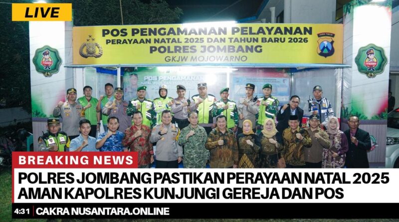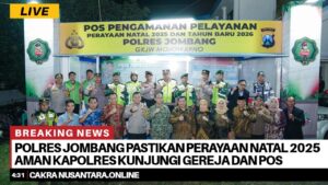 JOMBANG – Polres Jombang menunjukkan komitmennya dalam menjaga keamanan dan kenyamanan masyarakat selama perayaan Natal 2025 dan Tahun Baru 2026. Kapolres Jombang, AKBP Ardi Kurniawan, S.H., S.I.K., CPHR bersama jajaran Forum Koordinasi Pimpinan Daerah (Forkopimda) Kabupaten Jombang melakukan kunjungan ke sejumlah gereja dan pos pengamanan Natal dan Tahun Baru (Nataru), Rabu (24/12/2025) malam.