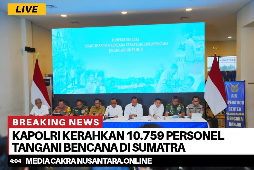 Jakarta – Kepala Kepolisian Negara Republik Indonesia (Kapolri) Jenderal Polisi Listyo Sigit Prabowo menegaskan bahwa Polri terus mengintensifkan pengerahan personel ke sejumlah wilayah terdampak bencana di Pulau Sumatera. Hingga saat ini, sebanyak 10.759 personel Polri telah diterjunkan untuk mendukung penanganan bencana dan pemulihan di lapangan.