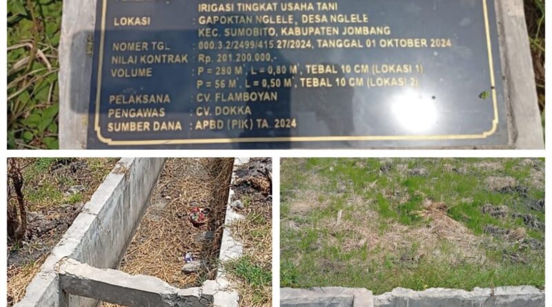Jombang – Proyek pembangunan jaringan irigasi tingkat usaha tani (JITUT) dari Dinas Pertanian Jombang yang berada di Desa Ngelele Kecamatan Sumobito seharusnya menjadi program yang bermanfaat bagi pertanian bukan mala sebaliknya.