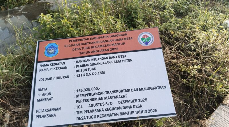 Lamongan – //Cakranusantara.online – Pembangunan jalan rabat beton yang dibiayai dari Bantuan Keuangan Dana Desa (DD) Tahun 2025 Desa Tugu Kecamatan Mantup Kabupaten Lamongan, menuai sorotan. Proyek dengan nilai anggaran mencapai Rp 165.925.000._ tersebut diduga tidak sesuai dengan Rencana Anggaran Biaya (RAB), khususnya pada spesifikasi yang dilapangan.