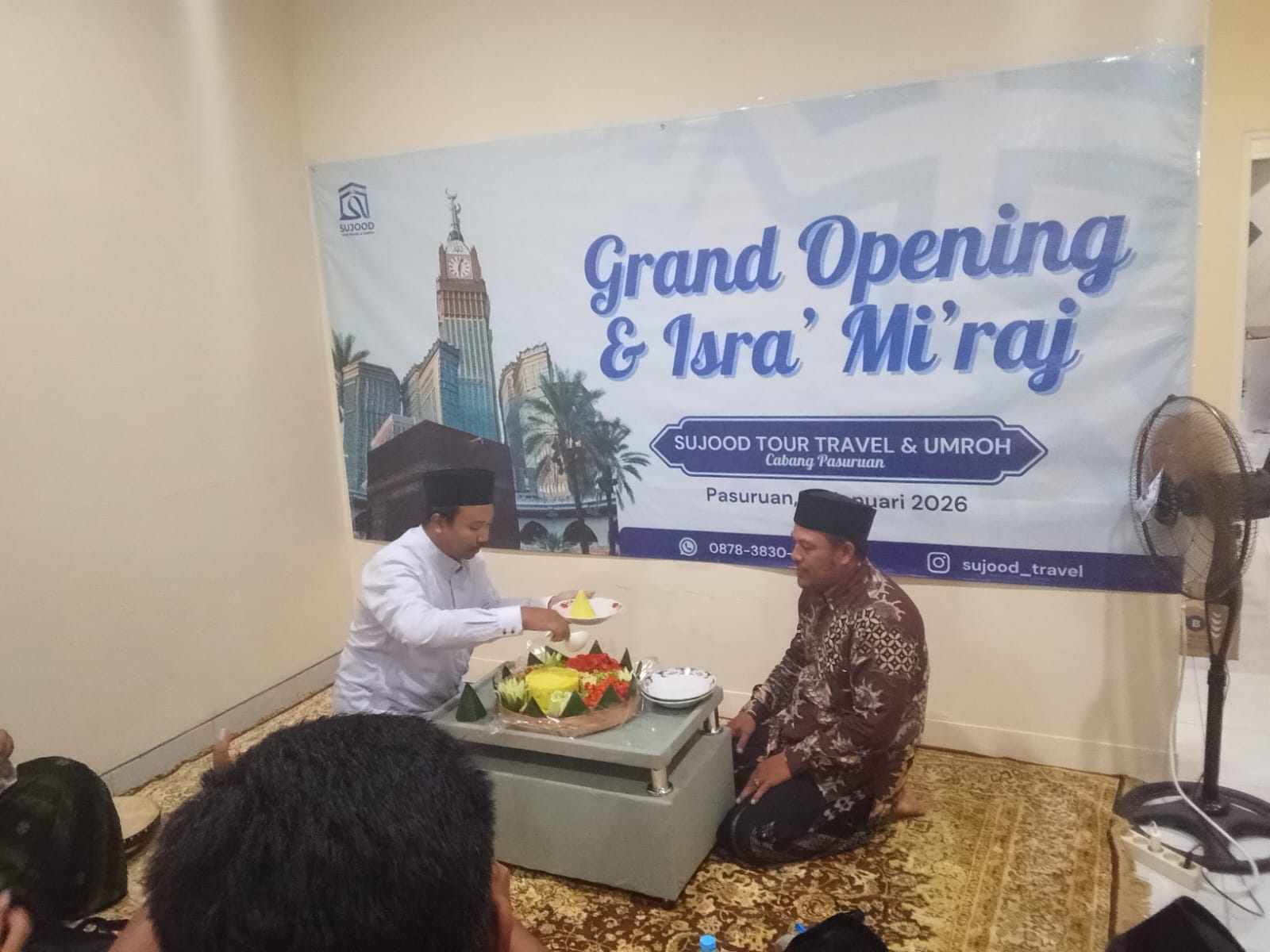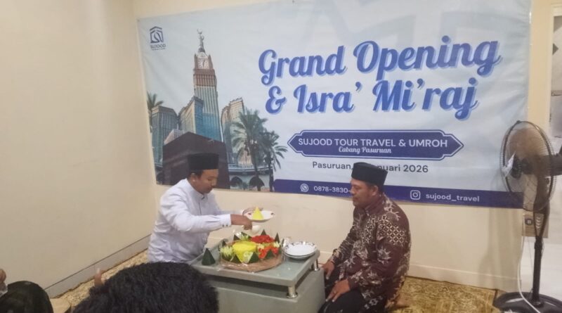 Kota Pasuruan — Sujood Tour Travel & Haji resmi membuka kantor cabangnya yang berlokasi di Pohjentrek, Kota Pasuruan, melalui kegiatan Grand Opening yang dirangkaikan dengan peringatan Isra Mi’raj Nabi Muhammad SAW, Senin (19/1/2026). Kegiatan berlangsung khidmat dan penuh nuansa religius, Adapun Pimpinan pemilik Sujood Tour Travel &Haji M.Hadad Alwi Nasyafiallah