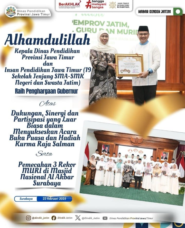 Surabaya – //Cakranusantara.online – 24 Februari 2026 – Prestasi membanggakan kembali diraih dunia pendidikan Jawa Timur. Kepala Dinas Pendidikan Provinsi Jawa Timur bersama 19 insan pendidikan jenjang SMA-SMK negeri dan swasta se-Jatim berhasil meraih Penghargaan Gubernur Jawa Timur atas dukungan, sinergi, dan partisipasi aktif dalam menyukseskan kegiatan sosial dan keagamaan.