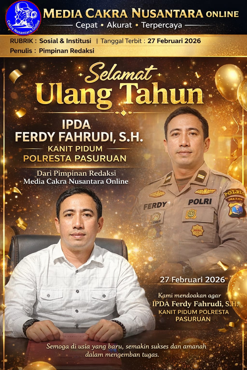 Sebuah momentum penuh makna menjadi refleksi perjalanan pengabdian dan dedikasi. Pimpinan Redaksi Media Cakra Nusantara Online menyampaikan ucapan selamat ulang tahun kepada IPDA Ferdy Fahrudi S.H, Kanit Pidum Polresta Pasuruan.