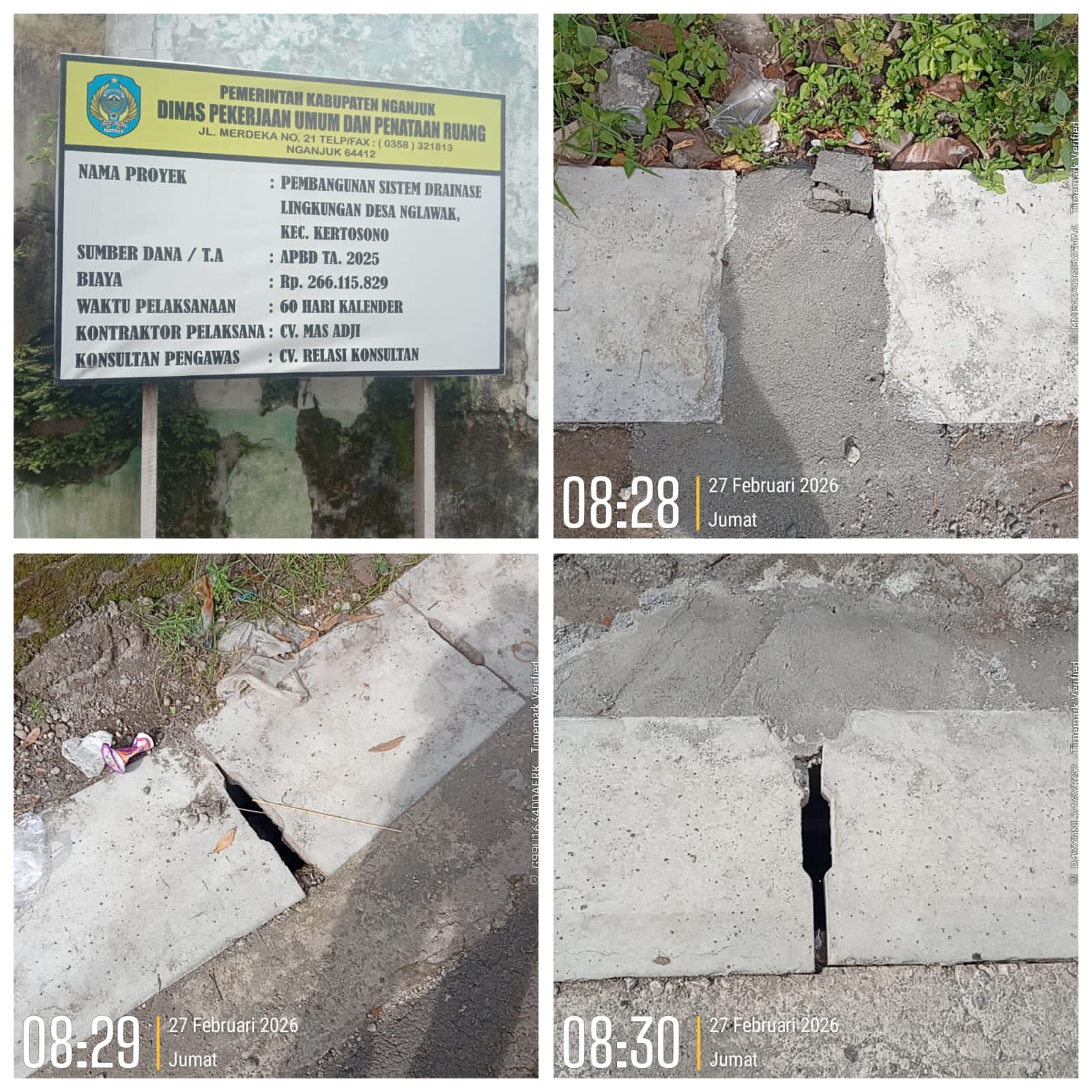 Nganjuk – Setelah ramai diberitakan beberapa media, tentang dugaan pembangunan sistem drainase (u ditch) di Desa Nglawak Kecamatan Kertosono yang asal jadi.