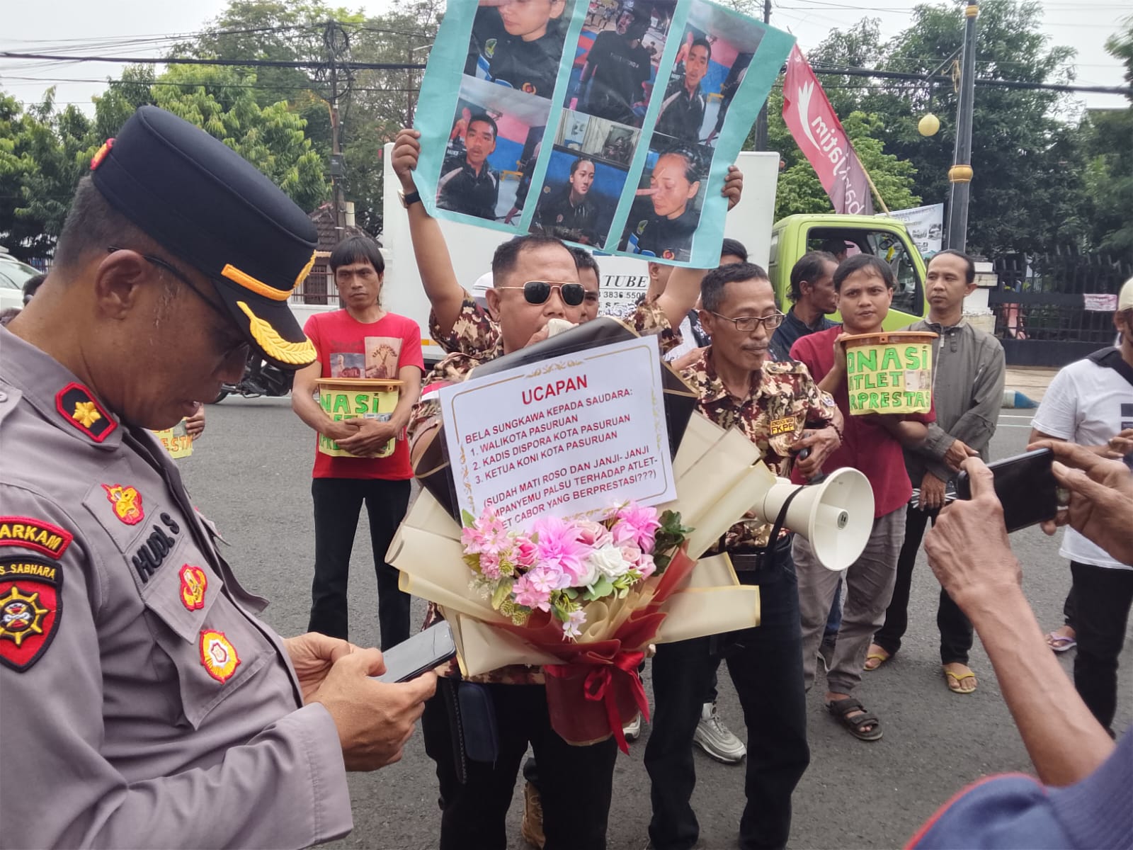 Ketua GM-FKPPI sekaligus Wagub LIRA Jatim, Ayi Suhaya, S.H., dalam orasinya menyampaikan kritik pedas. Ia mengirimkan karangan bunga bela sungkawa yang ditujukan kepada Walikota, Kadispora, dan Ketua KONI Kota Pasuruan sebagai simbol “matinya rasa” pimpinan daerah terhadap atlet.