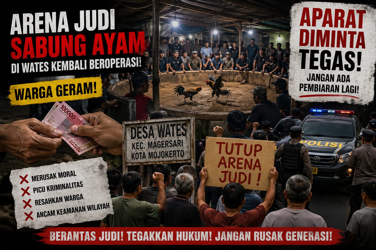 Ketika hukum seharusnya berdiri tegak, justru yang terlihat di Desa Wates, Kecamatan Magersari, Kota Mojokerto, adalah pemandangan sebaliknya: praktik perjudian sabung ayam yang kembali menggeliat seolah tanpa hambatan. Aktivitas yang sempat meredup itu kini diduga hidup kembali, bukan secara sembunyi-sembunyi, melainkan dengan keberanian yang menantang logika—dan secara tidak langsung, menantang wibawa aparat penegak hukum.
