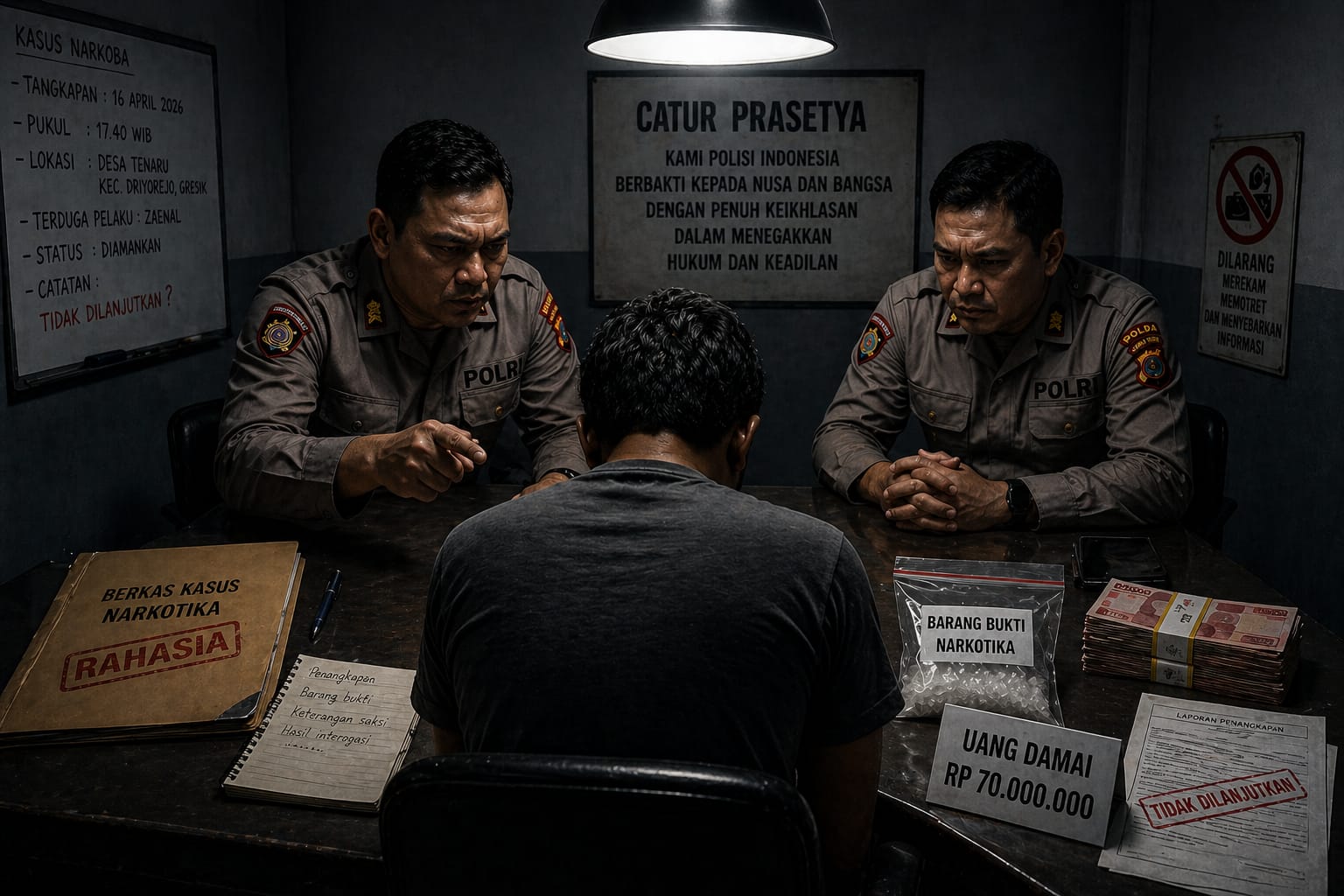 Di tengah gencarnya kampanye perang terhadap narkoba, sebuah ironi pahit justru mencuat dari Desa Tenaru, Kecamatan Driyorejo, Kabupaten Gresik. Dugaan praktik “tangkap lepas” dalam kasus narkotika kembali menyeruak ke permukaan bukan hanya sebagai isu biasa, tetapi sebagai sinyal bahaya bahwa hukum diduga sedang dipermainkan dari dalam oleh mereka yang seharusnya menjaganya.